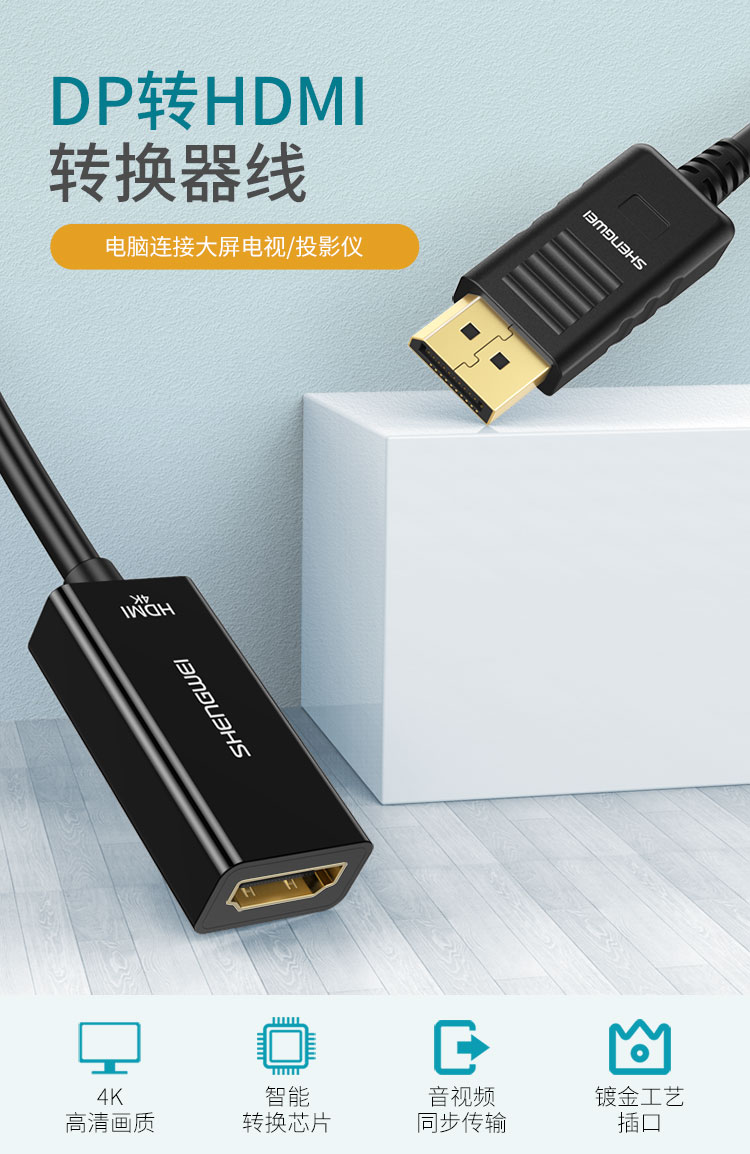 勝為DP轉(zhuǎn)HDMI轉(zhuǎn)換器 高清4K轉(zhuǎn)接頭 DisplayPort轉(zhuǎn)hdmi公對公 DP公轉(zhuǎn)HDMI母-4K高清 0.2米 MN-8004