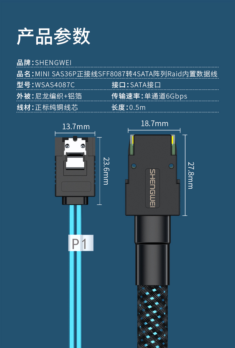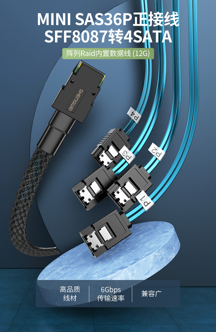 勝為MINI SAS36P正接線SFF8087轉(zhuǎn)4SATA陣列Raid內(nèi)置數(shù)據(jù)線 (12G) 0.5米 WSAS4087C