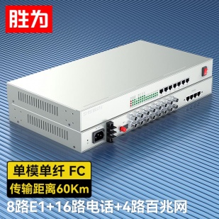8路E1+16路電話+4路百兆網絡 綜合業(yè)務電話光端機 PCM語音光端機 60KM FC單纖桌面式 一對 D8E16P18