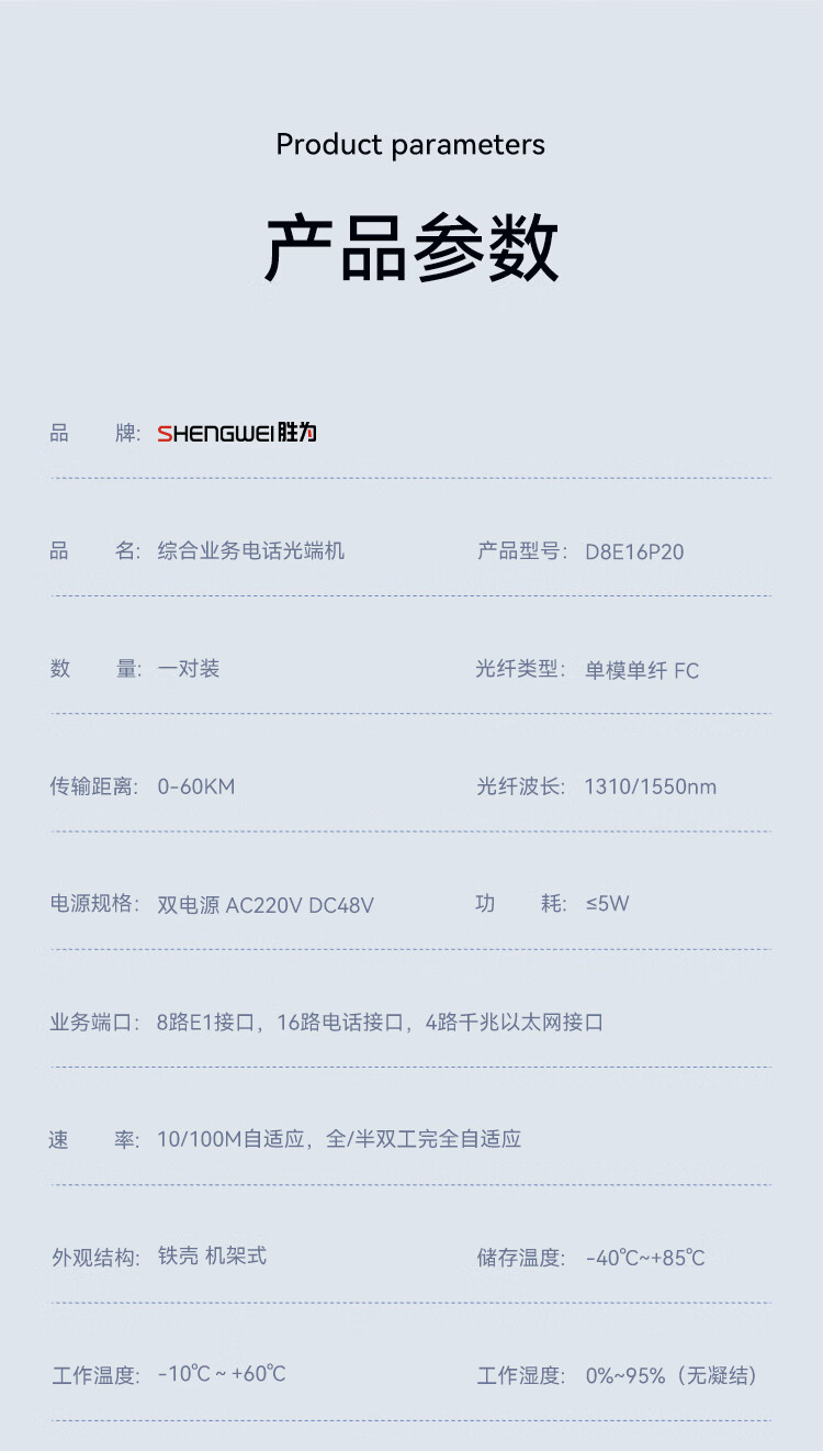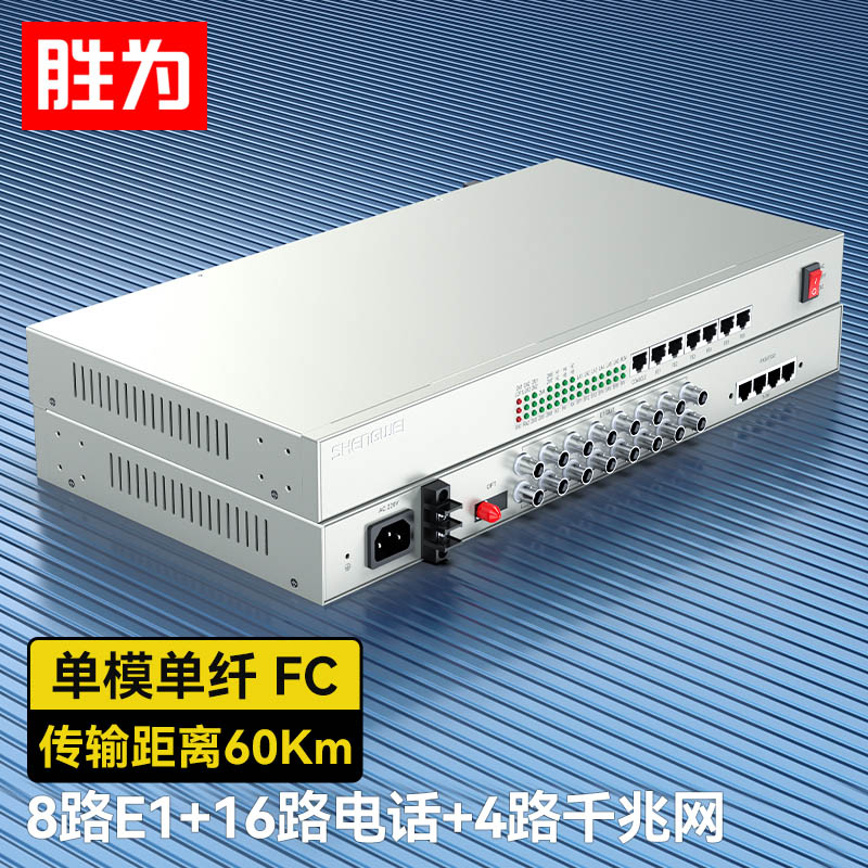 8路E1+16路電話+4路千兆網(wǎng)絡(luò) 綜合業(yè)務(wù)電話光端機 PCM語音光端機 60KM FC單纖桌面式 一對 D8E16P20