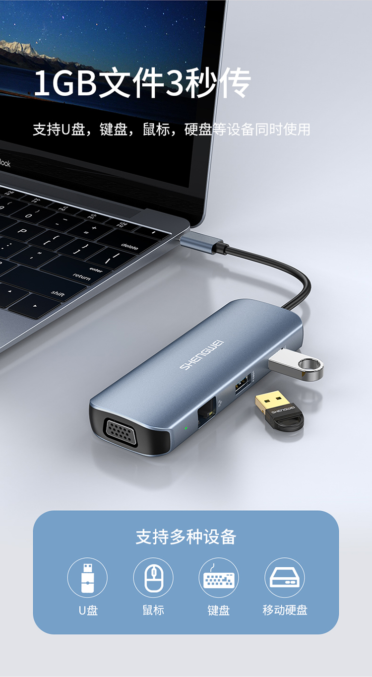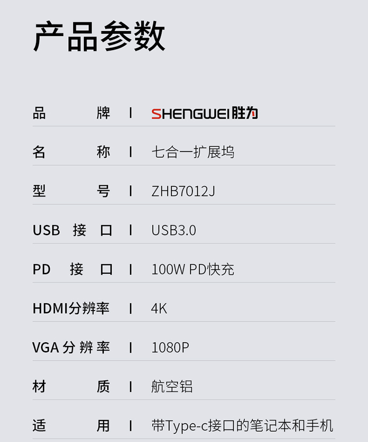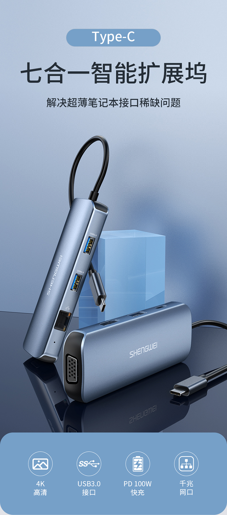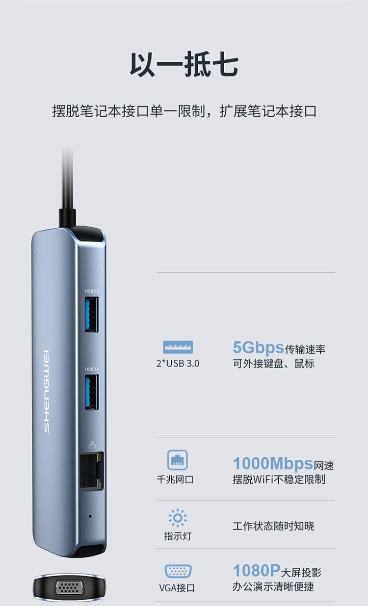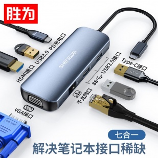 七合一擴(kuò)展塢 USB-C轉(zhuǎn)HDMI/VGA轉(zhuǎn)接頭投屏蘋(píng)果華為Macbook電腦轉(zhuǎn)換器千兆網(wǎng)口 勝為 ZHB7012J