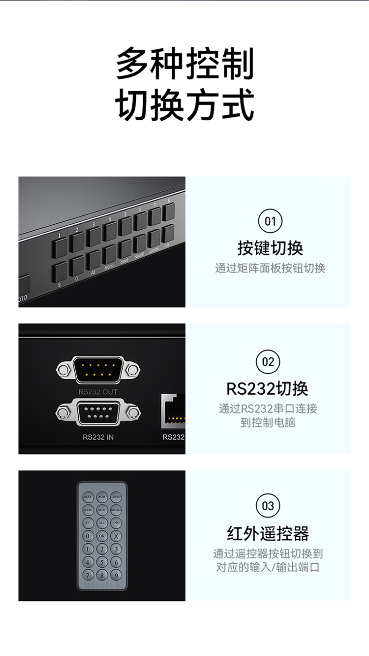 控制接口:1路RS-232IN、1路RS-232OUT、1路RJ45