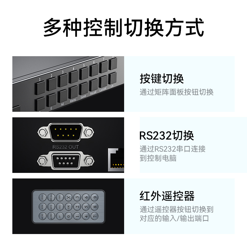 控制接口:1路RS-232IN、1路RS-232OUT、1路RJ45