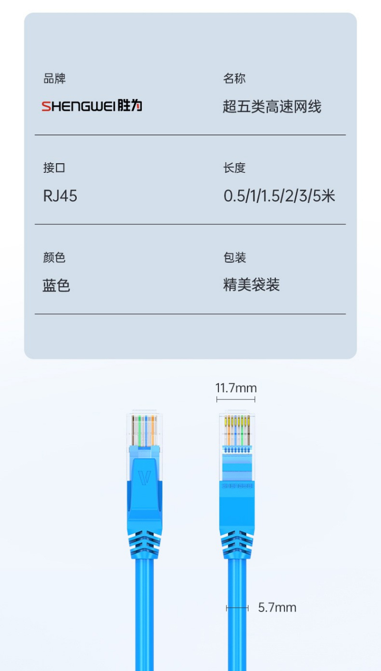 超五類網(wǎng)線 cat5e類百兆純銅 0.5-10米 藍(lán)色 勝為電腦/路由器/寬帶成品連接跳線 LC-20系列