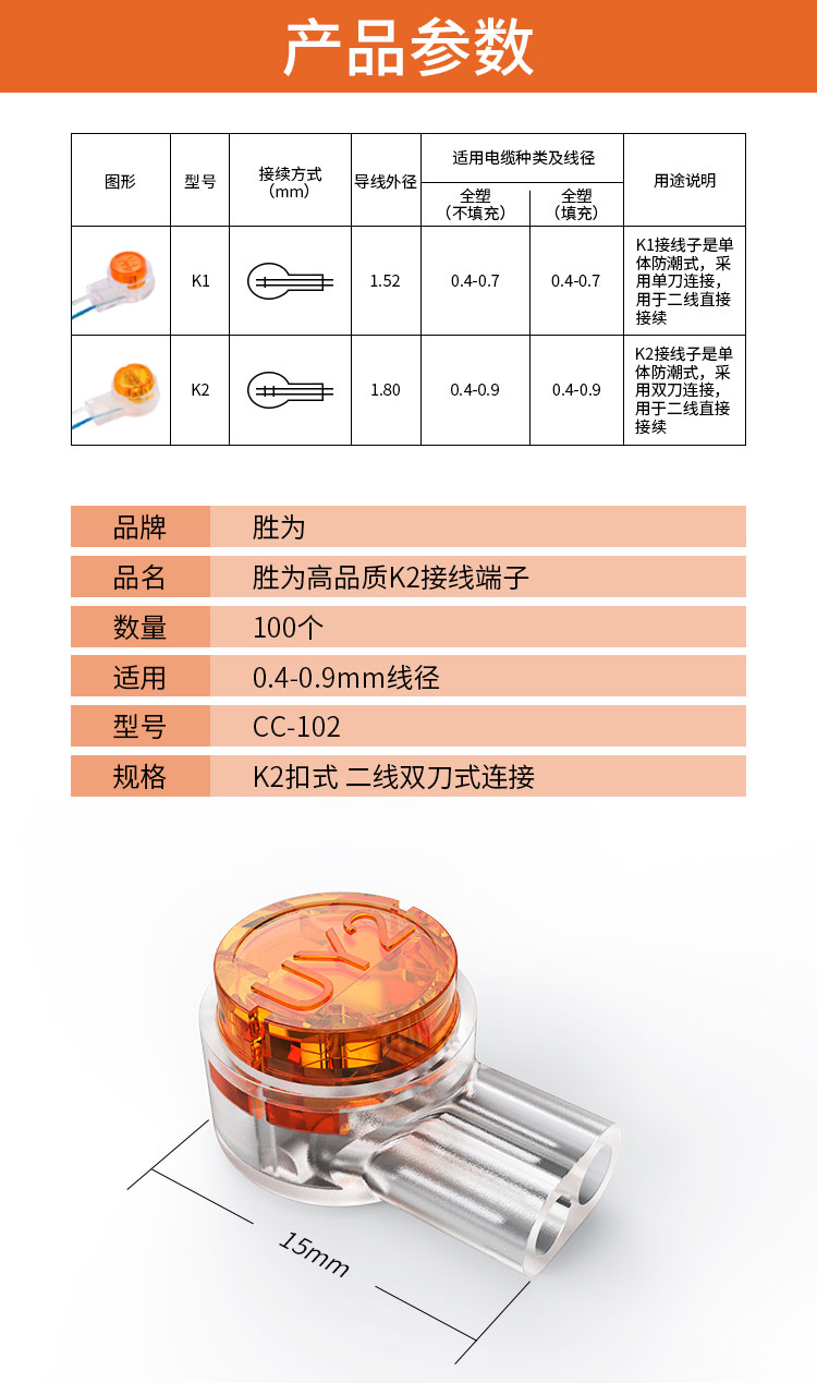 勝為 接線端子 K2工程專用電話線網(wǎng)線接線頭 環(huán)保三線雙刀雙線接頭100個(gè)/袋 CC-102
