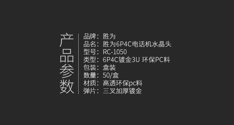 6P4C電話水晶頭 50個/盒 工程級純銅鍍金接頭 勝為4芯話筒非屏蔽RJ11接口 RC-1050