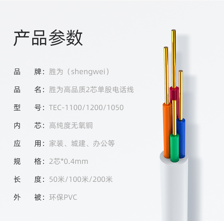 電話線 2芯單股無氧銅 勝為0.4mm座機(jī)/傳真機(jī)電話線100米 TEC-1100